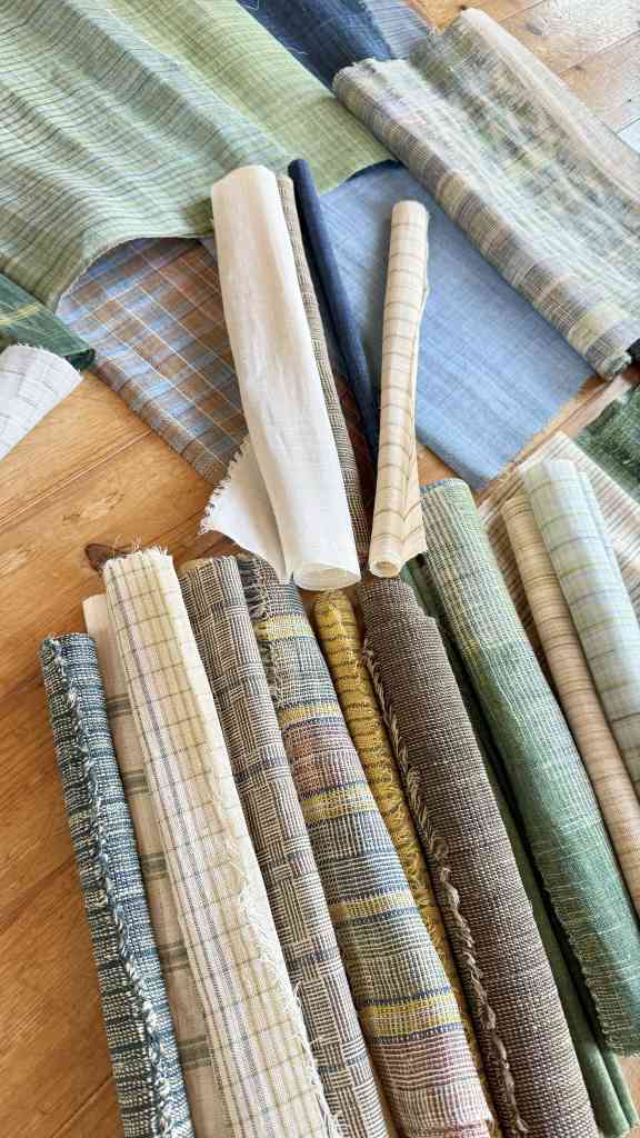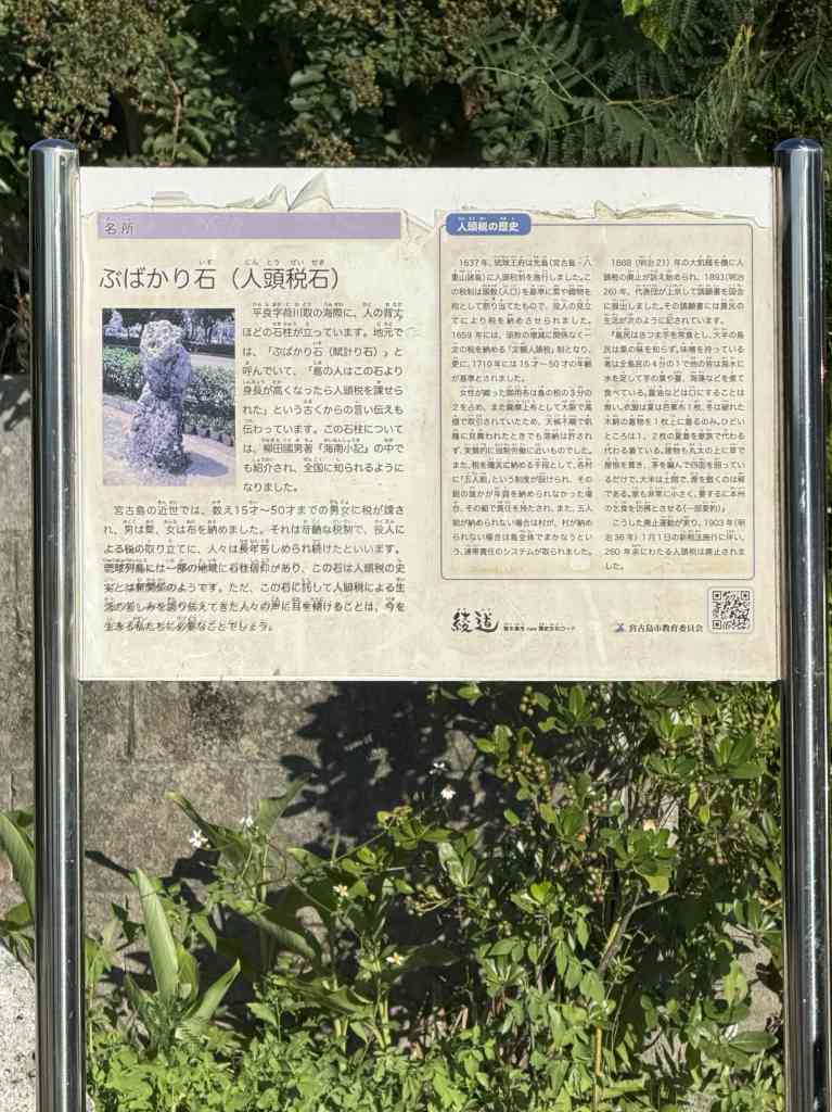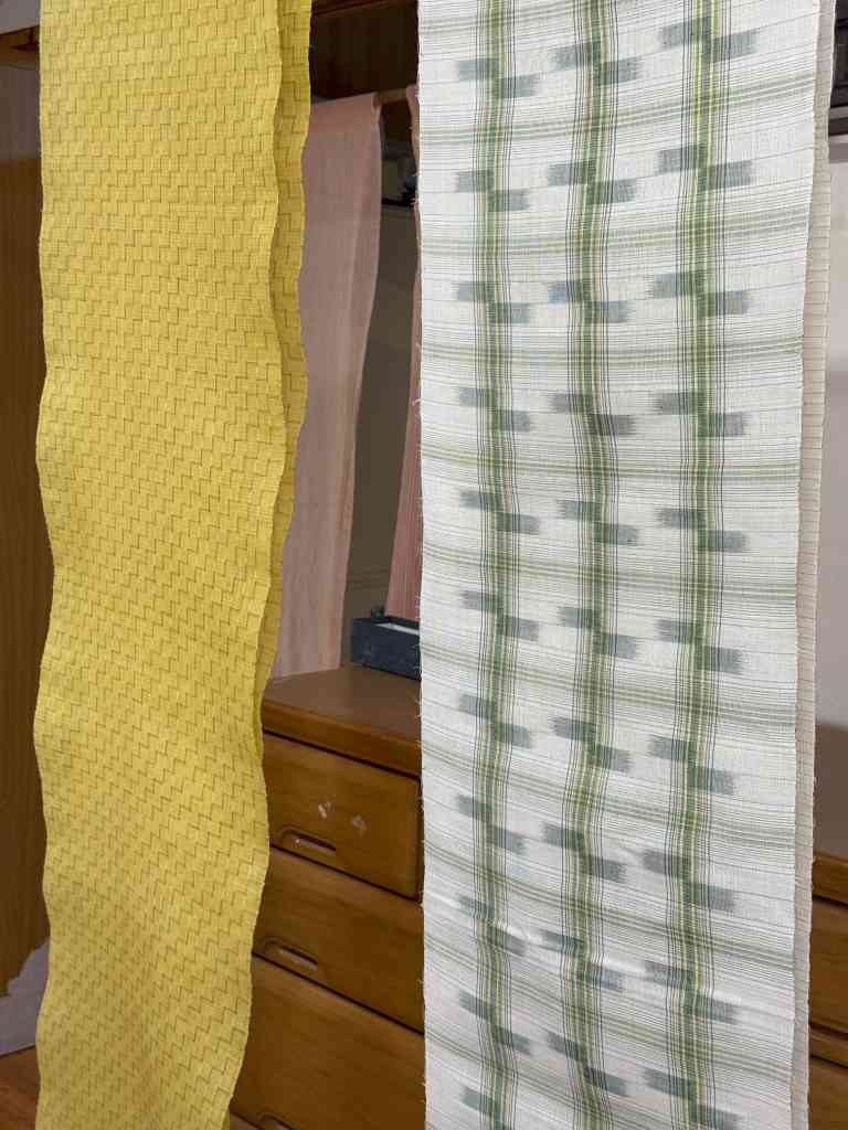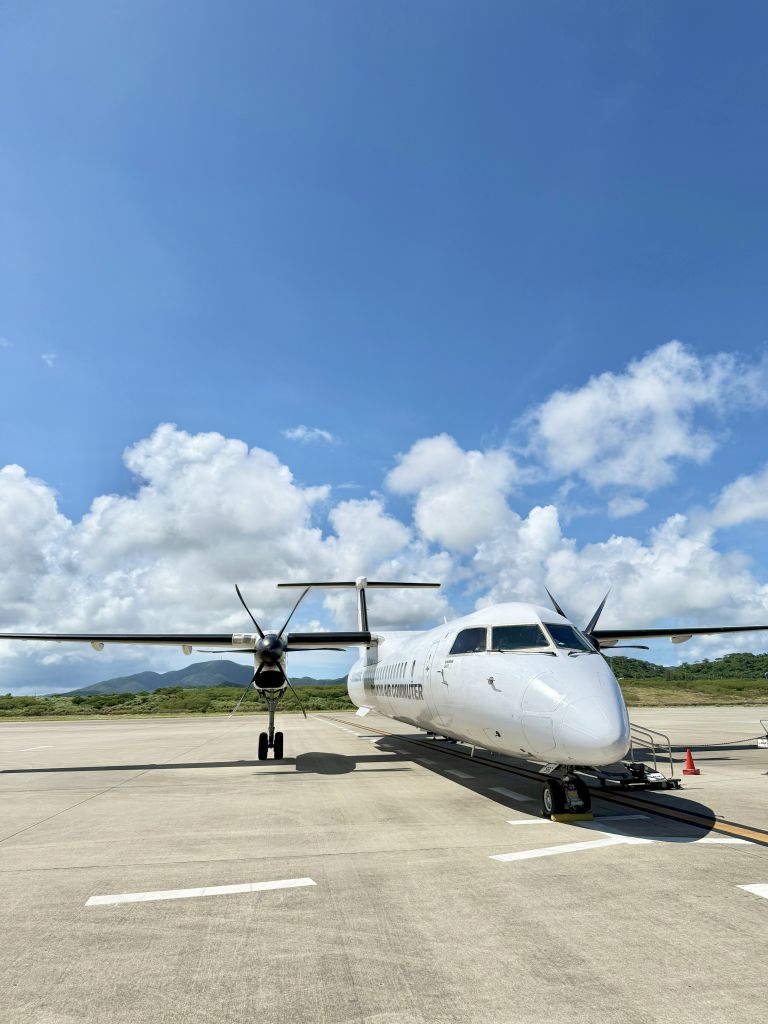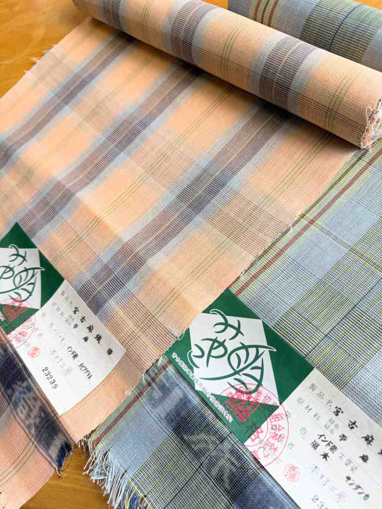2025.09.29 沖縄出張(離島編)③ ◆飛行機、苦手です… 沖縄出張3日目は移動までの時間にちょっと隣の島まで※港の前で3人組の方が歩いてて真ん中のちょっとアフロヘアーみたいな方、見たことあるなぁと思ったら「具志堅 用高」さん!声をかけようかと思いましたが人見知りなもので…いえいえ、旧盆でお里に帰っていたのでしょうから控えさせていただきました ◆らしい屋根瓦! 「ヨシダ」の社長様が「せっかくだから竹富島行って来たら?」と…※決して観光ではありません…本来であれば「水牛車」で浅瀬を渡って…時間的にも難しいので諦めました…※本当に観光ではありません…とりあえずそんなに広い島ではないようなので途中までバスで移動してそこから歩いて…無謀でした…いくら風があるからと言ってもやはり沖縄、日傘なしで歩くということはマジで危ないタオルをかぶってみても火に油を注ぐようで…倒れないうちに何とかお昼の場所へ…あ、次は宮古島に行かなきゃ…再び歩いて港まで… ◆おお! 暑いですが景色は抜群!非日常を感じて… なんとものどかな土地です… ◆プロペラ! いざ!宮古島へ! ◆Tシャツ・短パンの方がヨシダ社長! 着きました~ ◆素敵な建物! 一件お伺いしたのですが不在だったので次の目的地「宮古織物事業協同組合」さんへ この春から理事長に就任された「浦崎 美由希」さん、専務理事の「岩本 大輔」さんに館内を案内誌ていただきました※了承を得て展示物を撮影させていただきました 撮影可の機場 宮古織の特徴の一つ”砧打”の実演も拝見※大きな音がしますのでご注意ください かなりの重量があります(4㎏ほどだそうです) 私もさせていただいたのですが…面を平らにしてたたかないといけない…写真の通り傾いて当たってるところが散見されますそうすると生地が傷んでしまうのだとかやはり習得するにはそこそこの時間を要するようです そしていよいよお品を拝見残念ながら”宮古上布”着尺はなかったのですが…織りあがったばかりの宮古織、宮古麻織の着尺をゲット!そして、宮古上布の帯も!こちらは浦崎理事長が織られたもので砧打の前なんだとか…あ~早よ届かんかなぁ…素敵なお話しと共にお時間を作っていただきありがとうございました! 3日目が終了宿泊先近くにまたもや遺跡が「ぶばかり石」と言ってその昔この石より背が高くなったら”人頭税”を払うようになっていたとか…詳細は写真をご確認ください ◆三日目のランチ 実は二日目食べ損ねまして…やはり来たからにはソーキそばを…と、ここは竹富島、「お食事処 かにふ」さんにて「八重山そば」をいただきましたこれもおいしい!土地のものって良いですね~いかれる際には候補の一つにおススメします! 沖縄出張(離島編)④ 4日目沖縄出張最終日朝一で「新里 玲子」さんのところを訪問こちらでも色々とお話を伺わせていただきました宮古上布にとらわれることなく麻の織物が最近のお気に入りだとか生地見本の端切れも可愛らしい! 同行している「ヨシダ」の社長様が「何か分けてくれるものありますか?」と尋ねると「分けれるものは出してますよ」と…飾ってあったこちら二点を…さすがに買えない…悔しいですが買えない…その代わりじっくりしっかり見せていただきました良い色目でした… 新里さんのところで終了(?)との事飛行機の時間までだいぶ時間があるのでちょこっと散策※おっさん三人ですので観光ではありません… 飛行機の時間が迫ってきたのですが前日、不在だった「本村 三子」さんのところへダメ元で再チャレンジ居た~!お邪魔しました現状お話しなどをお聞きして「ヨシダ」の社長様が粘っていくつか分けていただけることになりましたこちらも良いお色目!ありがたいです! 宮古島から那覇へ移動福岡経由で帰るので乗り継ぎの時間がだいぶあり那覇空港でお土産をと首里城は2026年の秋に復活予定なのですね~また来れたらいいなぁ…あ、来年2026年 1/22㈭・23㈮・24㈯の3日間「工房巡り”だけ”の沖縄ツアー」はあと2名ほど募集しております!今回は離島はありませんが…・知念紅型研究所・大城廣四郎織物工房・野原織物工房・読谷山花織事業協同組合・知花花織事業協同組合・和宇慶むつみさんの工房上記所へお伺いする予定です少人数で間違いなくマニアックで楽しいツアーですのでぜひぜひご参加ください! ◆やっぱり飛行機、苦手です… 福岡へ向かう飛行機17時台ということで丁度夕焼けが見えました瀬戸内と違い地平線に沈む夕日がきれいだこと…隣の席の方が偶然にも広島の方ということもあり盛り上がって帰りましたザザっと振り返りましたが、沖縄と言えどもこの業種はどこかしら後継者不足だったり作れなくなってきているものがあったりと…私どもができることは一生懸命技術と伝統をつなげて伝えていこうとしている方々いるということをご紹介することですどうぞお品を見ながらお話ししましょうそしてその奥深い世界を感じましょうご遠慮なくお越しくだ